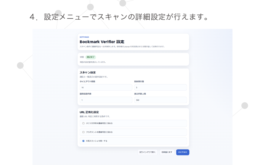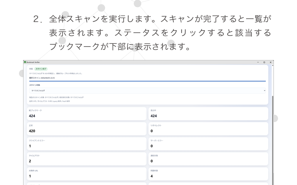 Bookmark Verifier は、Chrome のブックマークを整理・点検するための拡張機能です。保存済みブックマークを一括スキャンし、HTTP ステータスに基づいて状態を分類表示します。リンク切れ候補、通信失敗、重複 URL を一覧で確認でき、不要なブックマークを選択して削除できます。